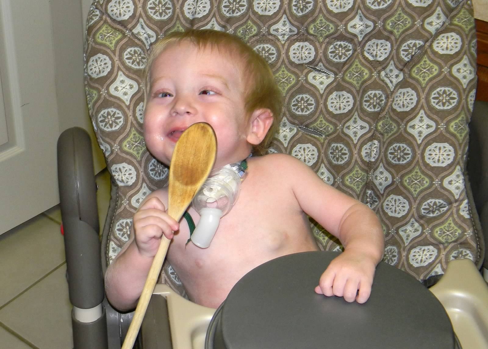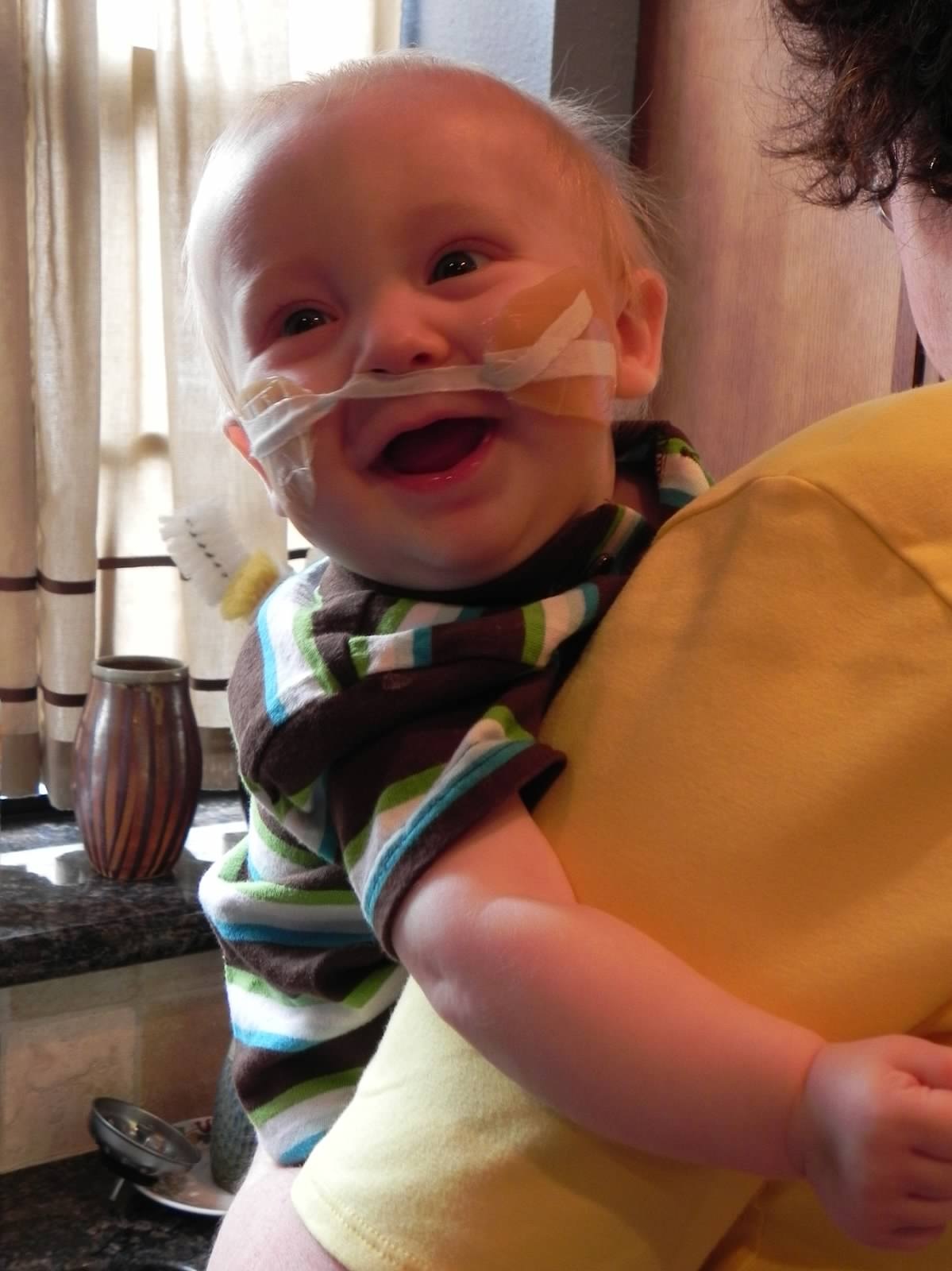 Dallas got his trach on August 18, 2011 after a respiratory arrest. The day after surgery, Dallas was lying in bed with his right ankle resting on his left knee like he was catching some rays on the beach. A few days later, Dallas sat with help in his Bumbo chair so he could bang on his xylophone. Despite sedation making his aim a bit off, Dallas just kept on playing.